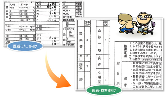 図1-左は、健康診断の数値ですが、お医者さま向けのものはある程度の知識がないと何を書いているのか分かりませんよね。この健康診断の結果を正しく判断してアドバイスができるのは、医療の専門家であるお医者さまです。これらの数値を分析して、図1-右のように注意点や改善策をまとめることで、初めて一般の患者さんにもその意味が分かるようになるのです。