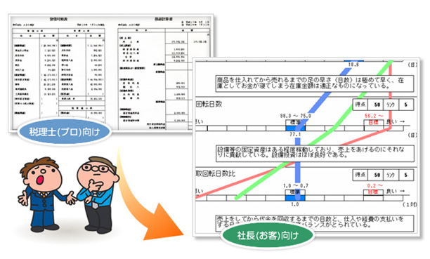 そこで、もっといろいろな切り口から問題点を探り、図やグラフを交えながら、しっかりと自社の経営状態を把握してもらおうと考えたのが、この経営診断サービスです。