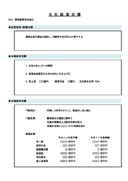 中期経営計画で設定した目標にそって、今期の行動目標と数値目標を設定し、具体的な経営計画書を作成します。 今期の行動目標は、「会社全体」、「部門」、「個人」というように落とし込んでいきます。 |